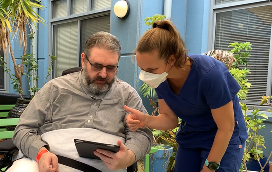 Inspirational music plays over clips of RMH staff and patients interacting with each other.